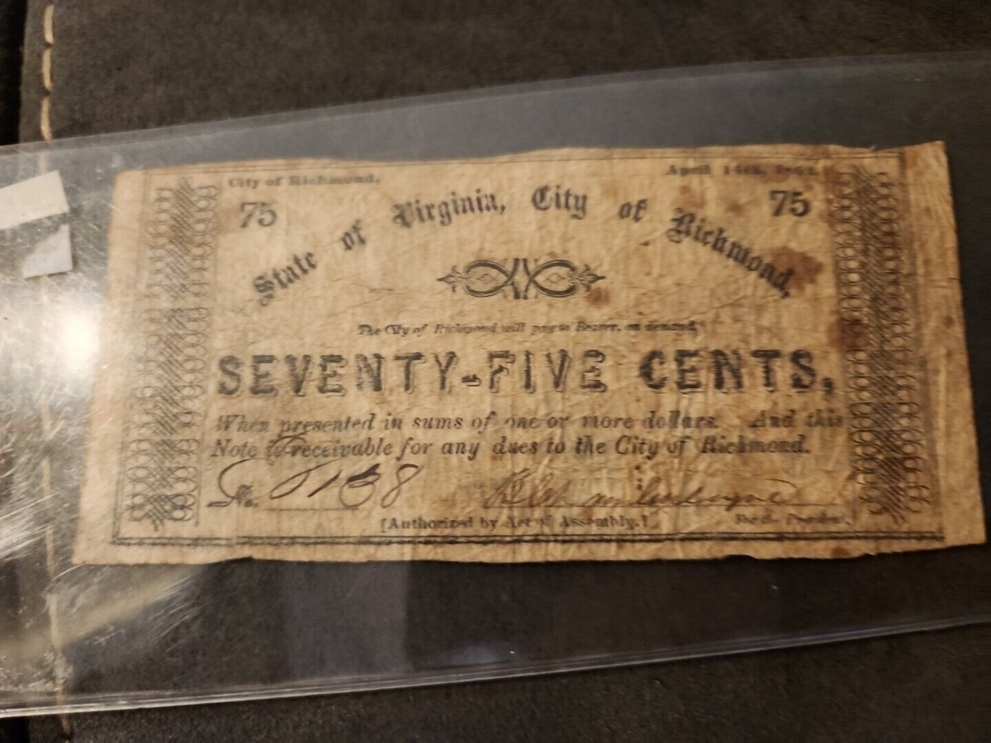1862 RICHMOND VIRGINIA .75 OBSOLETE CURRENCY NOTE VG