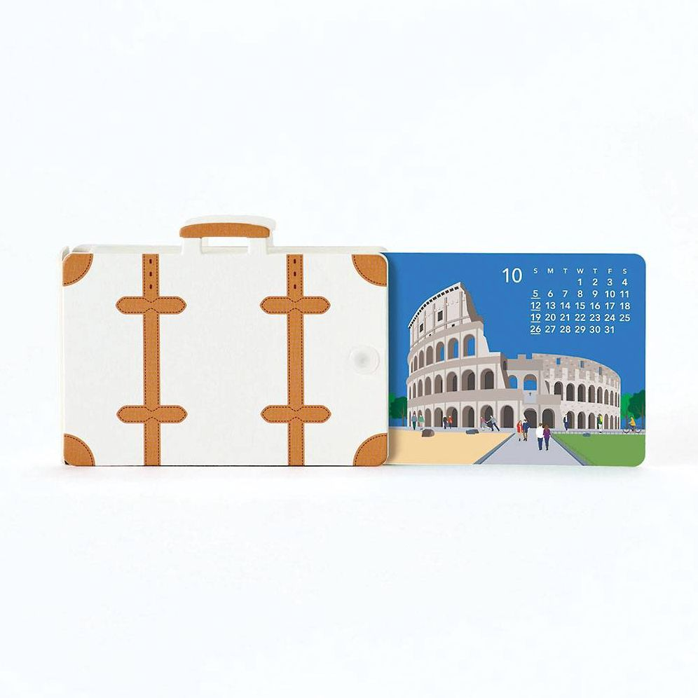 The Travel is a calendar based on the theme of a trip around the world. To use it, rotate the pages inside the suitcase with scenes of different locales on the front and maps on the back. You can enjoy a worldwide tour of different cities and scenery all year long.