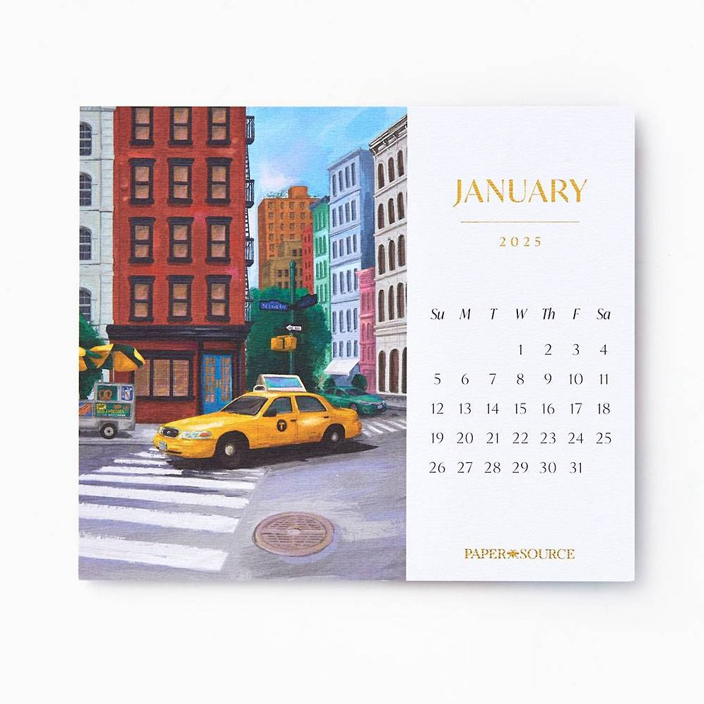 This 2025 Twelve-Month Postcard Calendar by Paper Source has monthly views with dates, and a perforated 4″ x 6″ postcard. The back of the postcard features space for you to write a message and a spot for an address. Flip over the front cover and 12 months grids for 13 bonus 6″ x 7″ art prints! Date pads have gold foil details.