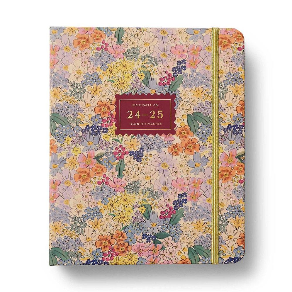 Start planning ahead with our 2025 17-month planner. A sturdy hard cover wraps over the interior spiral binding, and an elastic band holds the pages closed. Inside you’ll find monthly and weekly views, inspirational quotes, sections for celebrations, notes and contacts, pocket folders for storage, and three sticker sheets for extra fun.