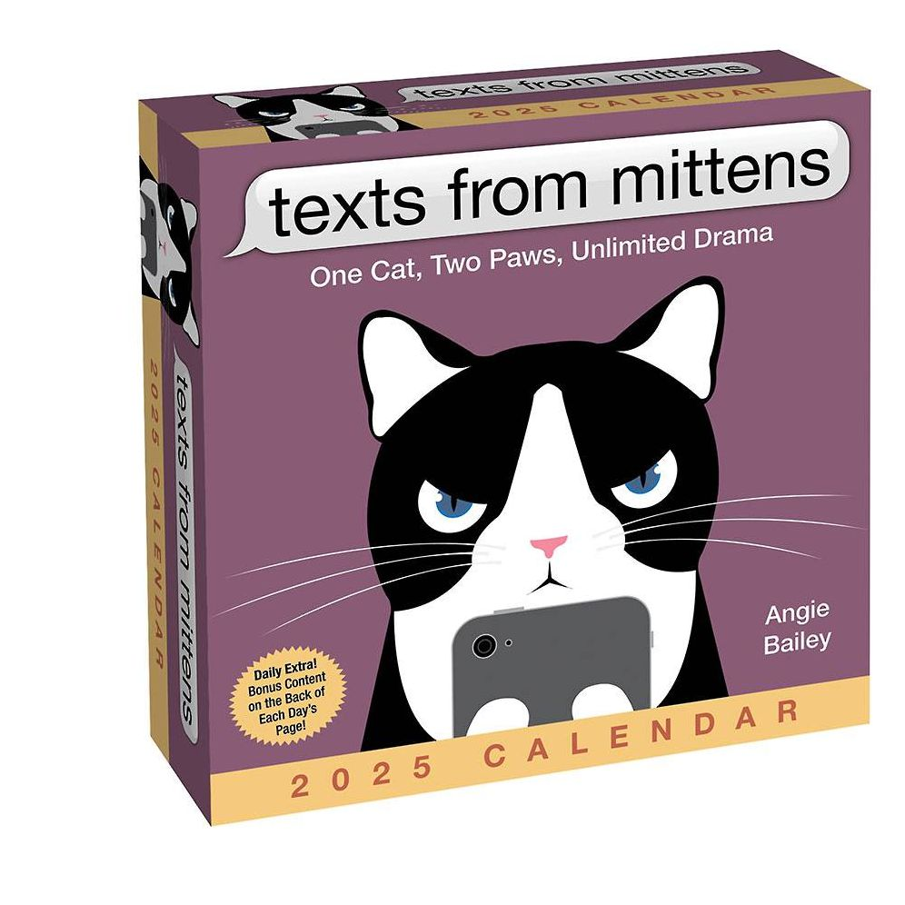 The Texts from Mittens 2025 Day-to-Day Calendar pulls back the curtain on the amusing inner life of housecat Mitty via text messages with his patient human and glimpses into the zany antics of his animal friends. Come for the drama but stay for the liver treats.