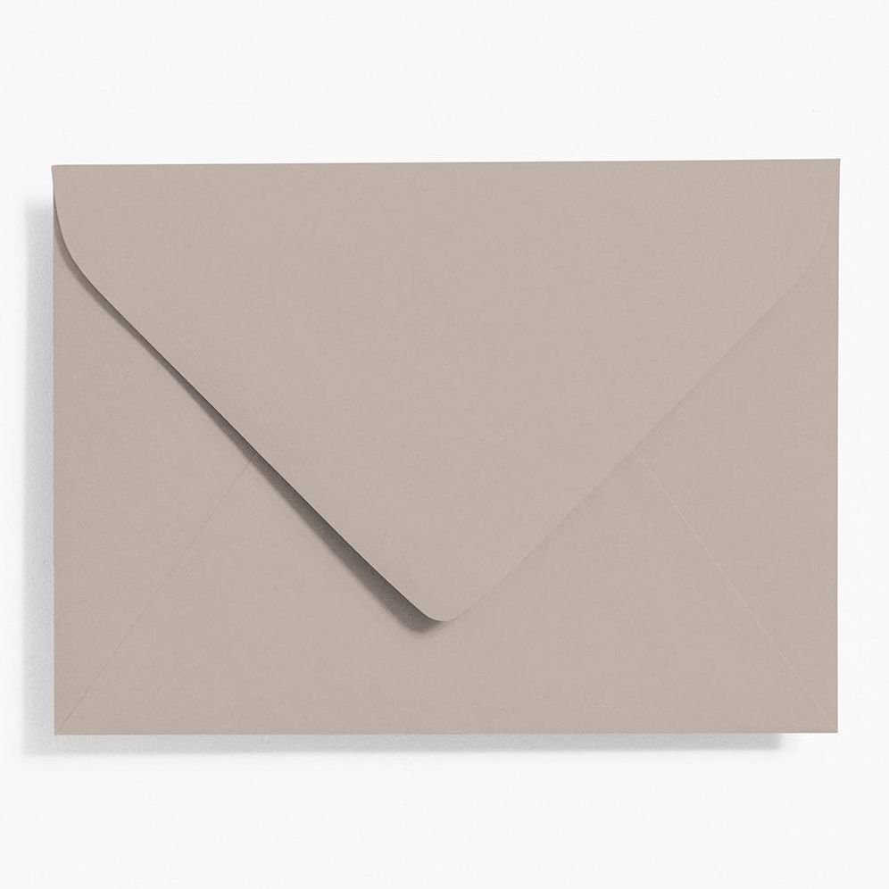 Our stylish European inspired pointed flap envelope in the classic wedding size. In gravel, the consummate urban color. Dark, dirty and complex, gravel looks great with black.