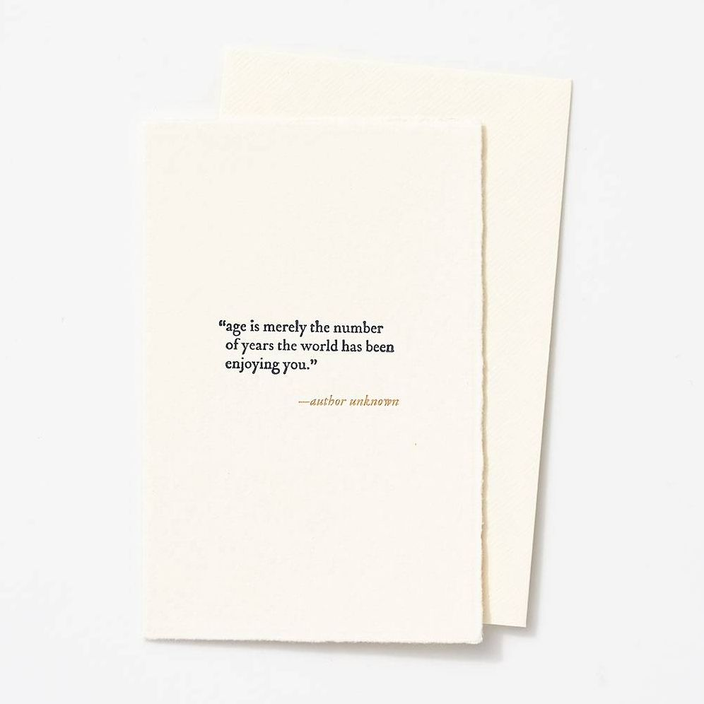 Don’t worry about your age, it’s merely the number of years the world has been enjoying you! With its beautiful quote, this finely crafted card is the perfect sweet sentiment. Blank inside. Paired with coordinating envelope. By Occasionally Speaking.