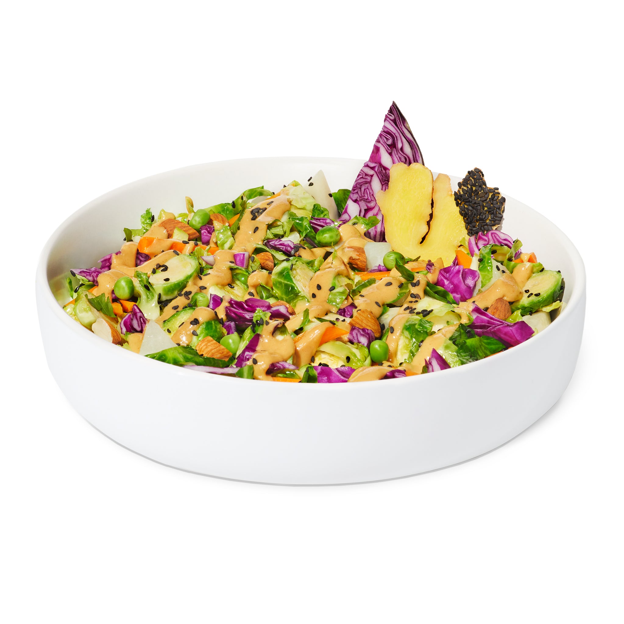 A little leafy, a lot crunchy. This colorful combo of Brussels sprouts, carrots, red cabbage, peas, kohlrabi, and celeriac is tossed with a creamy, nutty sesame dressing. Makrut lime and lemongrass add a touch of zest to pull it all together. 10 grams of protein make it so, so satisfying.