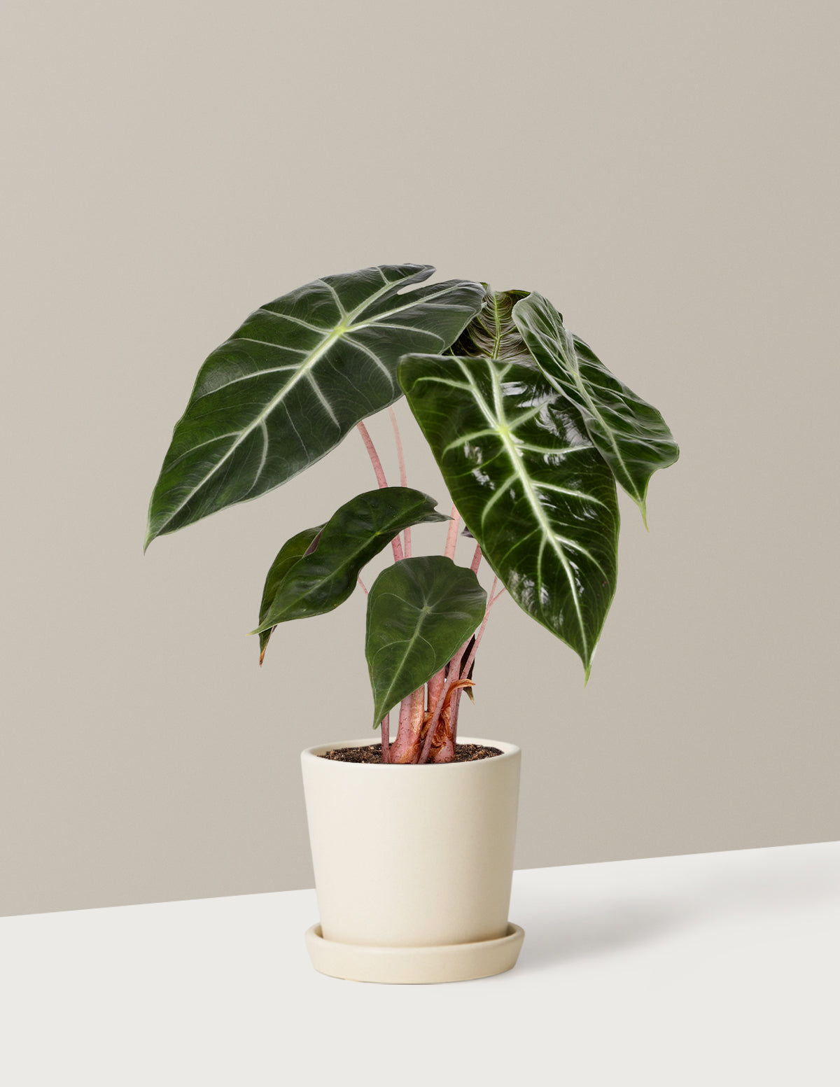 The Alocasia ‘Pink Dragon’ is an eye-catching houseplant known for its unique combination of deep green leaves and striking pink stems. This plant thrives in bright, indirect light and prefers a humid environment, making it perfect for bright bathrooms or kitchens. The Alocasia Pink Dragon rewards with its exotic appearance and vibrant colors, adding a touch of drama and elegance to any indoor space.