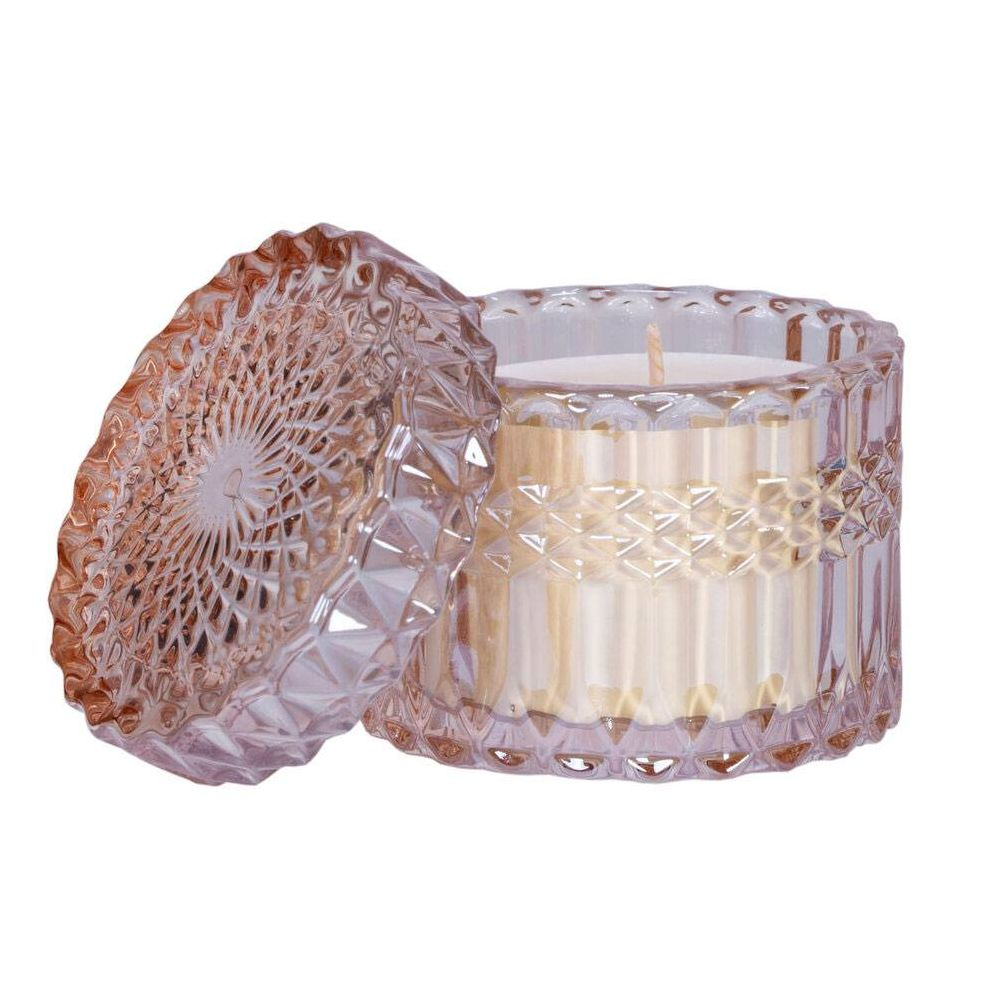 Alluring Amber Petite 8oz Shimmer Candle is an alluring blend of Sugared Tangelo, White Amber and Starflower. By Soy Essentials
