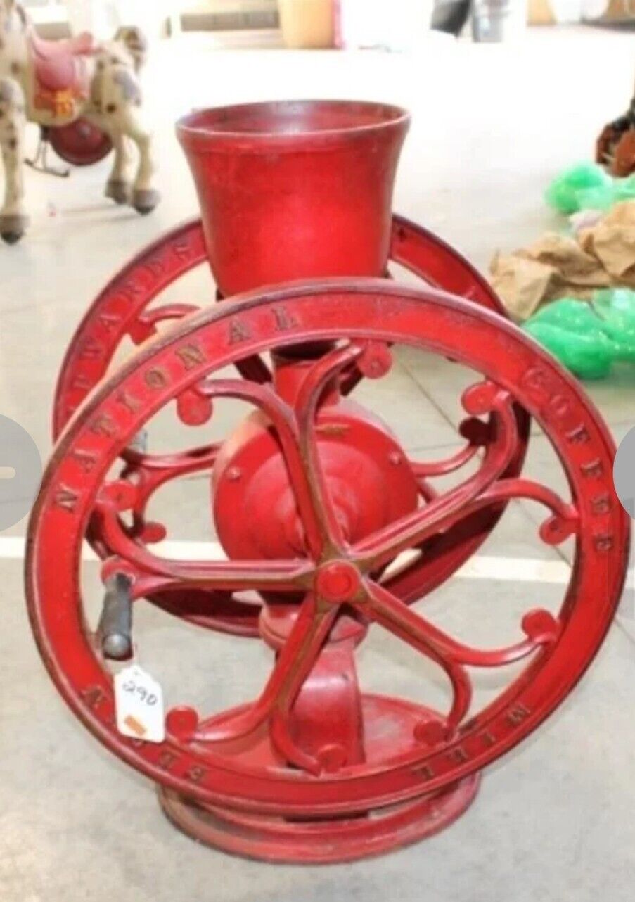 ELGIN NATIONAL COFFEE MILL BY WOODRUFF & EDWARDS CO., ELGIN, ILL, 26″ TALL X 18″ WIDE (PLUS 2 HANDLES, CRANKS) X 13″ BASE, (2) 19″ WHEELS W/5 SPOKES, NO LID,