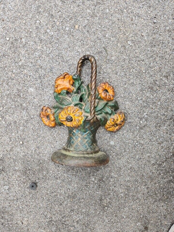 Antique Painted Heavy Cast Iron Flower Basket Doorstop 9″