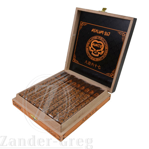 The Asylum 867 Auntie is a uniquely flavored cigar that employs the steeping method to impart its distinct flavors. This marks the first instance where Asylum introduces what they term as “aromatic flavors via exotic tobaccos.” This Honduran puro features an enticing maduro wrapper. After the cigars are expertly rolled, they undergo flavor infusion either by submersion in a flavored liquid or through methods akin to aroma therapy. In this process, the cigars are placed in a sealed environment, allowing them to absorb the rich flavors. Handcrafted in Honduras at the CLE Cigar Company factory, the Asylum 867 Auntie, formerly known as the Deadwood Tobacco Co. Chasing the Dragon Auntie, maintains the same blend and delivers the delicious flavor profile associated with its previous name.