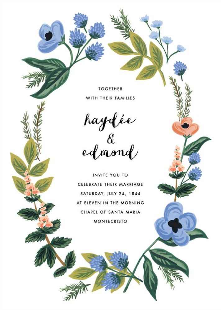 Write all of your big day details within this wreath bordered wedding invite by Rifle Paper Co. for Paperless Post These wedding invitations are perfect for your big day with illustrations of colorful flowers and lush greens. Printed on superfine white paper, which has a smooth finish and is soft to the touch. 130# cover weight paper with 30% post consumer recycled content.