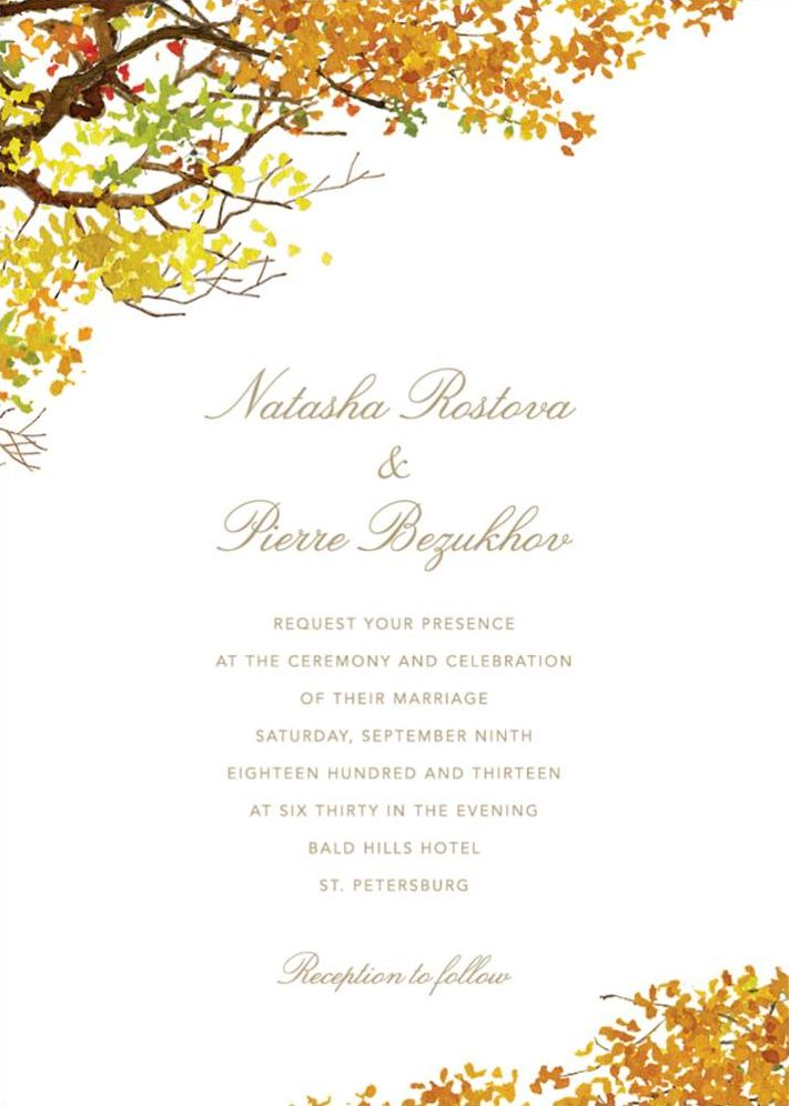 Fall weddings have such romantic ambiance. Share the feeling of fall through your wedding invitations by Felix Doolittle for Paperless Post. This invite features changing colors on trees. Printed on superfine white paper, which has a smooth finish and is soft to the touch. 130# cover weight paper with 30% post consumer recycled content.