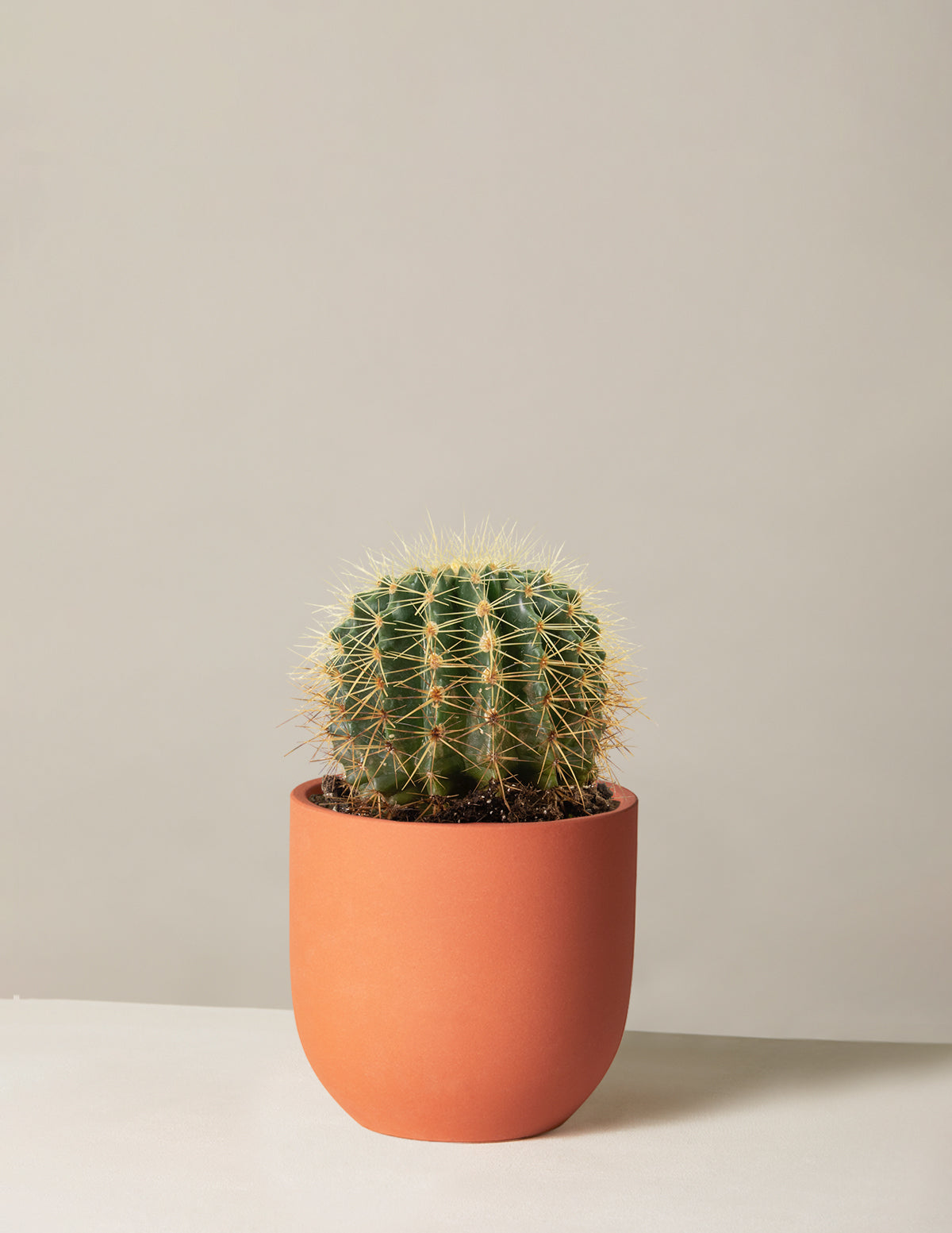 The Barrel Cactus is a species of Ferocactus that gets its name due to its barrel shaped stem which bares thick stiff spines. This cactus is prized for its beautiful blooms around Spring/Fall that encircle the crowns diameter once it reaches maturity.