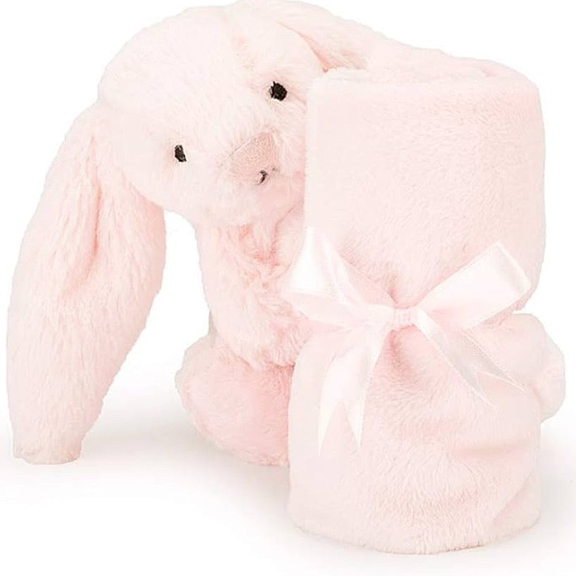 A perfect gift for newborns, the Bashful Pink Bunny Soother is our most loved Bashful Bunny in a soft fur, with long lopped ears, a pink suedette nose and stitched eye detail holding a square shaped soother, un-stuffed and irresistibly soft to touch. Made from recycled fibers and neatly rolled up and presented with a Baby Jellycat grosgrain ribbon.