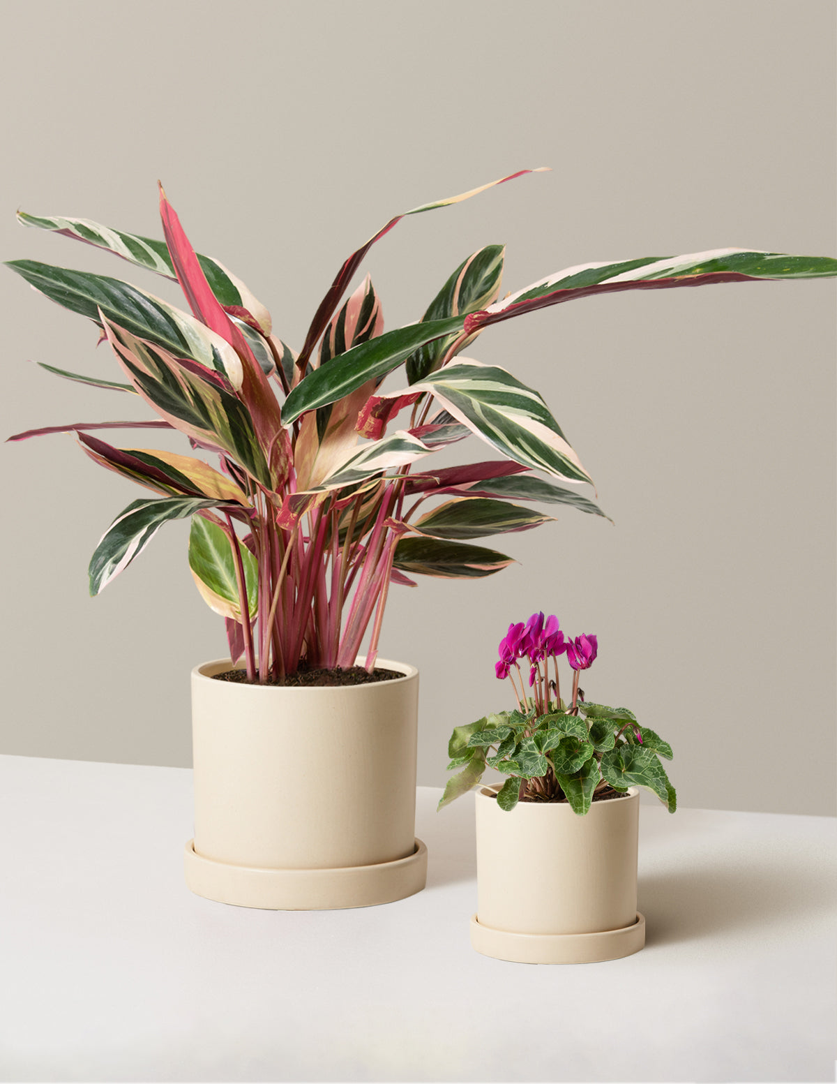 This valentines duo pairs together two of our most colorful houseplants. Our small vibrant Cyclamen, with pink or purple flowers, alongside our elegant Stromanthe triostar.