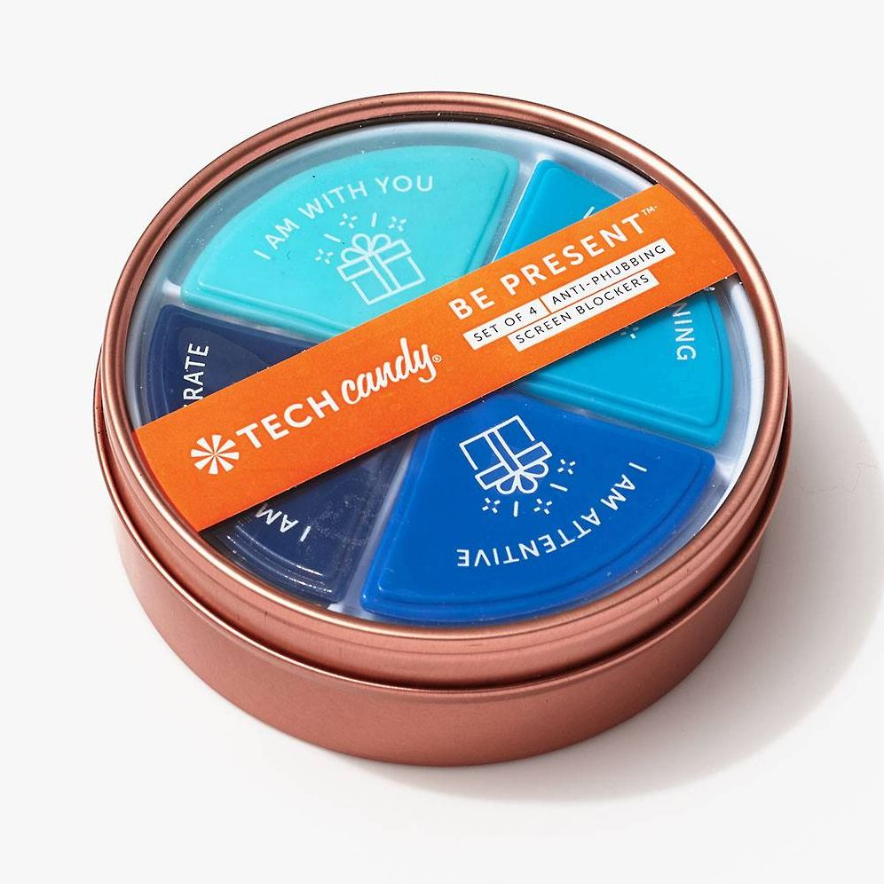 Stop the phubbing‚Äîsnubbing someone in favor of a mobile phone‚Äîwith this tactile nudge to put phones down & keep heads up. Perfect for use at the family dinner table, date night, during office conference table talks, or anywhere you want to practice staying present. Clings can be strategically placed to block social media & other distractions, while still allowing users to see important calls that can’t be missed. When finished, collect & store the clings with their protective film back in the handy tin. Set contains 4 reusable gel clings in a cute little rose gold metal storage tin.