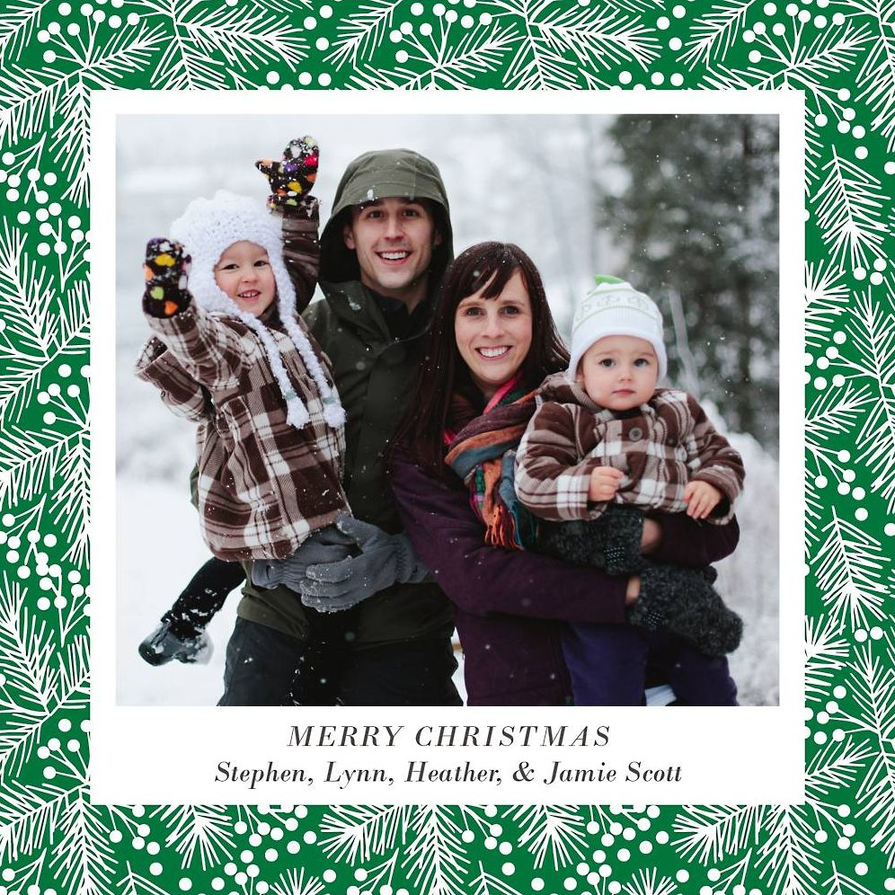 A pretty pine branch border in your choice of red or green makes the perfect frame for your photo on this holiday photo card from the designers at Paper Source. Personalize your message and use the back to send more photos or updates of your year! Printed on Mohawk ultra white 120 lb. card stock that is soft to the touch and matches our superfine white envelopes. Paper is FSC certified and made using wind power.