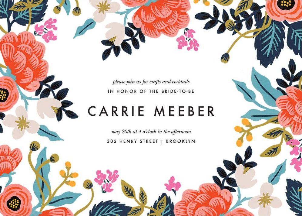 Celebrate the bride to be and shower her with love and presents! Start the planning process right, with these Rifle Paper Co. for Paperless Post bridal shower invitation cards. Bordered with a bouquet of the most colorful florals you’ve ever seen. These invites will fit any theme perfectly. Printed on white smooth paper, which has a smooth finish and is soft to the touch. 130# cover weight paper with 30% post consumer recycled content.
