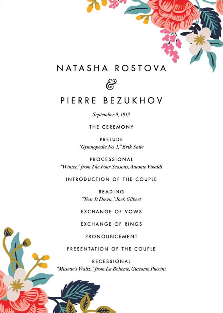 Keep everyone on schedule on your big day with these program cards. Place each of them as a part of your place setting. These Rifle Paper Co. for Paperless Post program cards are perfect to list all the details of your event and is bordered with their classic floral design in vibrant colors. Printed on Mohawk superfine white 130 lb. card stock that is soft to the touch and matches our superfine white envelopes. Paper is FSC certified and made using wind power.