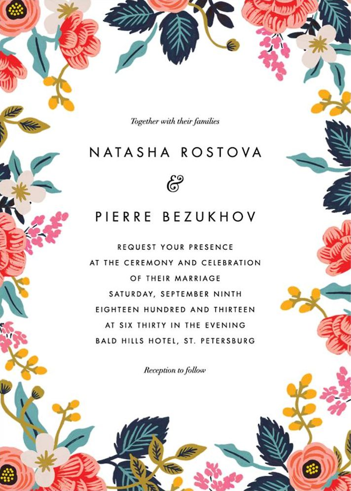 Gather your family and friends for your big day with these gorgeously bordered Rifle Paper Co. for Paperless Post wedding invitations. The border features colorful pops of vibrant hues perfect for a feminine and classy wedding theme. Printed on superfine white paper, which has a smooth finish and is soft to the touch. 130# cover weight paper with 30% post consumer recycled content.