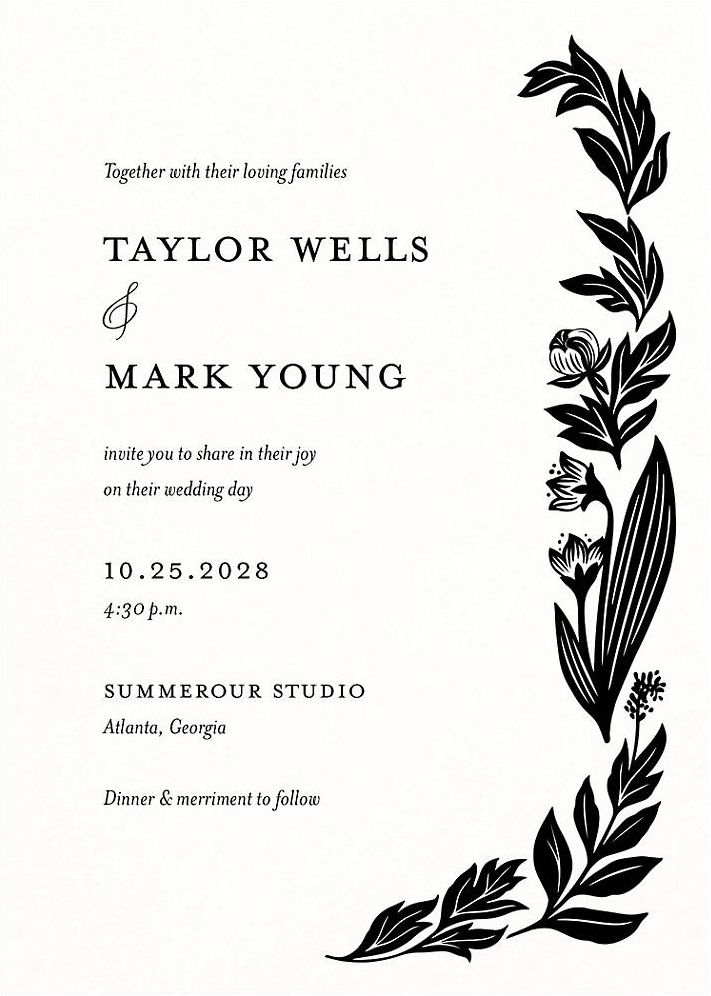 Chic and modern, simple but striking, and botanical yet bold; these invitations feature a stunning monochromatic floral design.