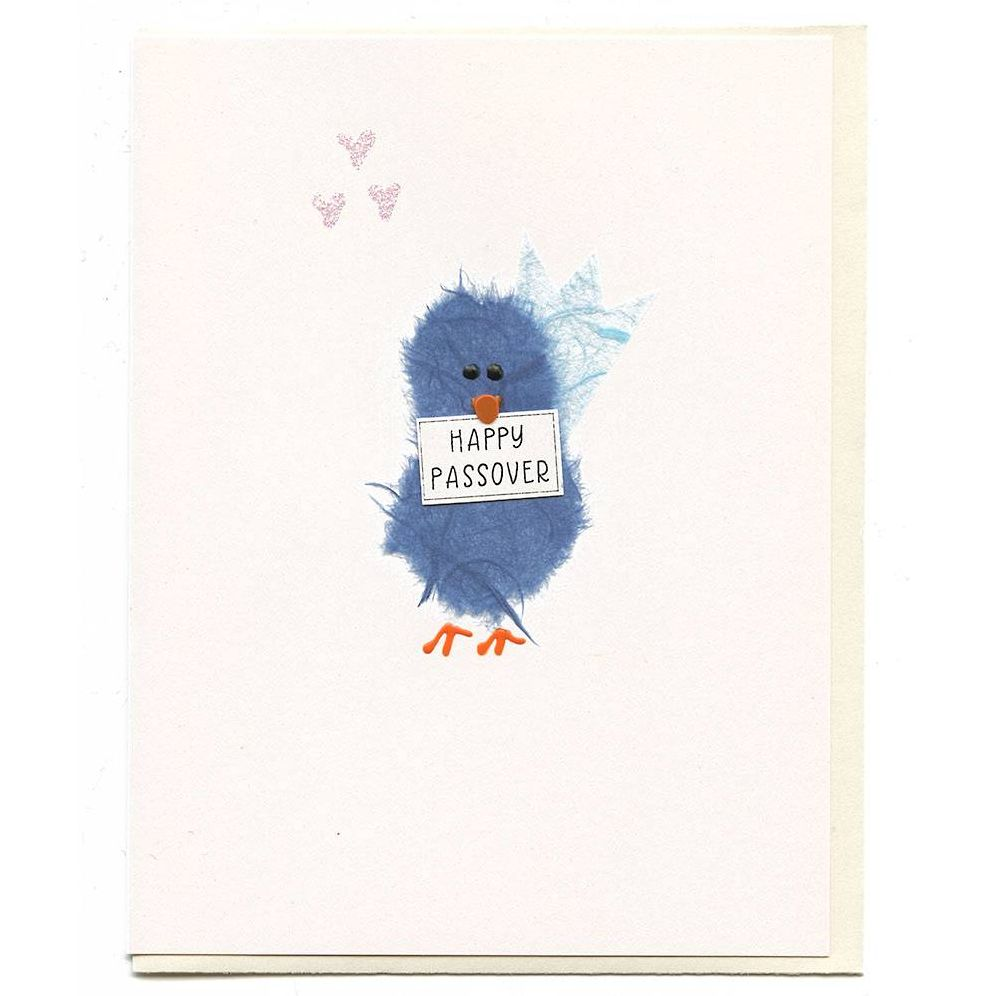 This sweet card featuring a fluffy blue bird holding a sign that reads, “Happy Passover.”