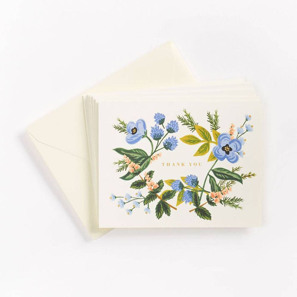 This sophisticated design is a thoughtful way to say thanks! Vintage-inspired design from Rifle Paper Co. features a bouquet of blue and coral blossoms with Thank You written gold foil. Blank inside. Paired with a white envelope.