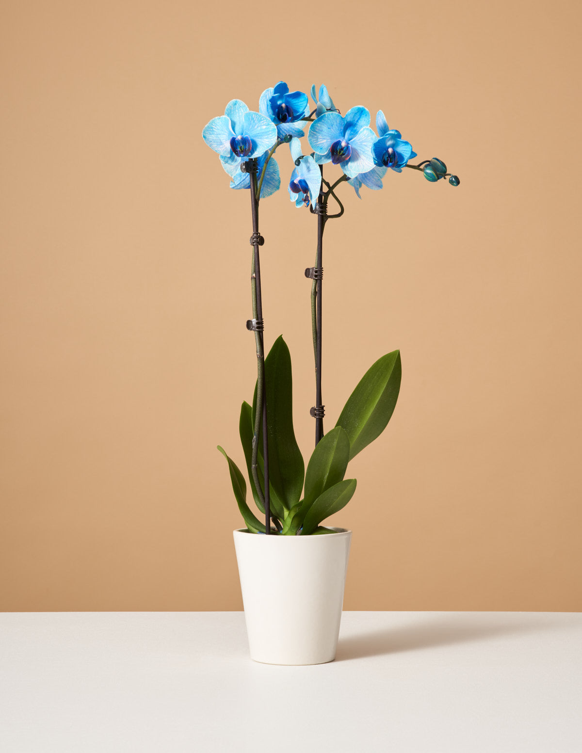 The Blue Watercolor Orchid achieves its look through a special process in which dye is injected into the stem, giving the petals their bright, gradient coloring. The dye is completely safe and causes no harm, though please note that when this plant re-blooms, it’ll be its natural color (white or light pink). This is a Phalaenopsis orchid, which typically blooms about once a year for up to three months. Non-toxic to pets.