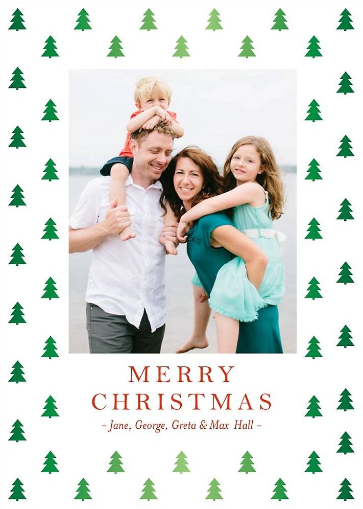 Cute little foil trees border your customizable details on this fun holiday photo card from the designers at Paper Source. Personalize your message and use the back to send more photos or updates of your year! Printed on Mohawk ultra white 120 lb. card stock that is soft to the touch and matches our superfine white envelopes. Paper is FSC certified and made using wind power.