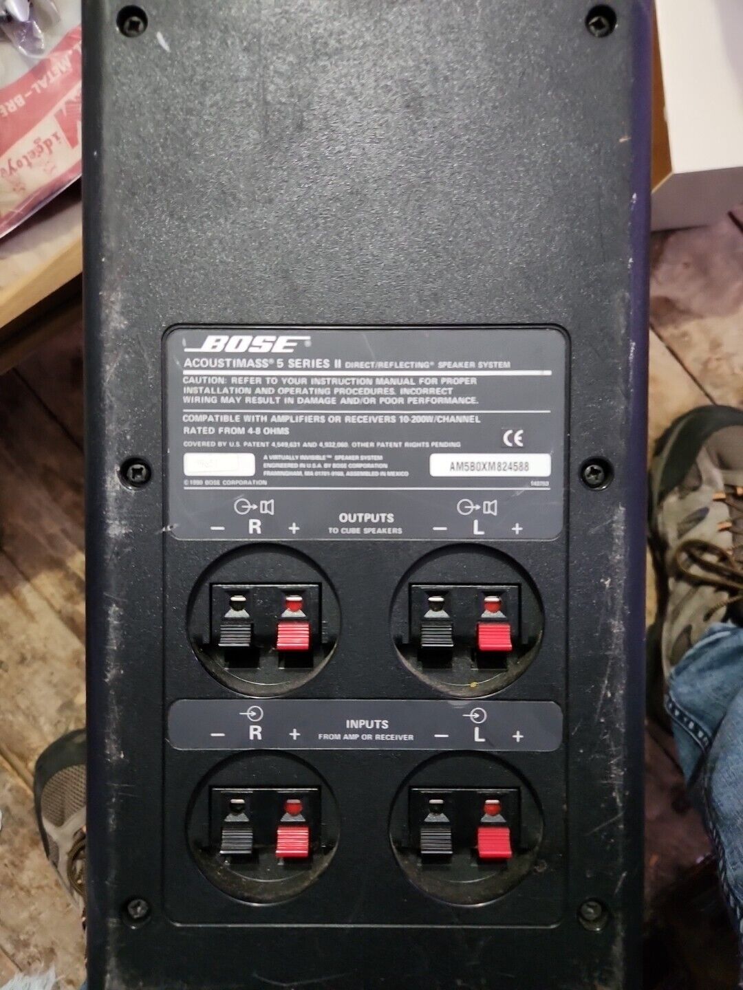This is a Bose Acoustimass 5 Series III Direct/Reflecting Speaker System Subwoofer in black. It has a cube shape and a 4.0 channel system configuration. The speaker is compatible with wired connectivity and has stereo L/R RCA audio inputs. It is a subwoofer type speaker with a RMS power output of 10-200 W per channel. The impedance and driver size are not specified. The speaker is designed for home audio use and is manufactured by Bose.