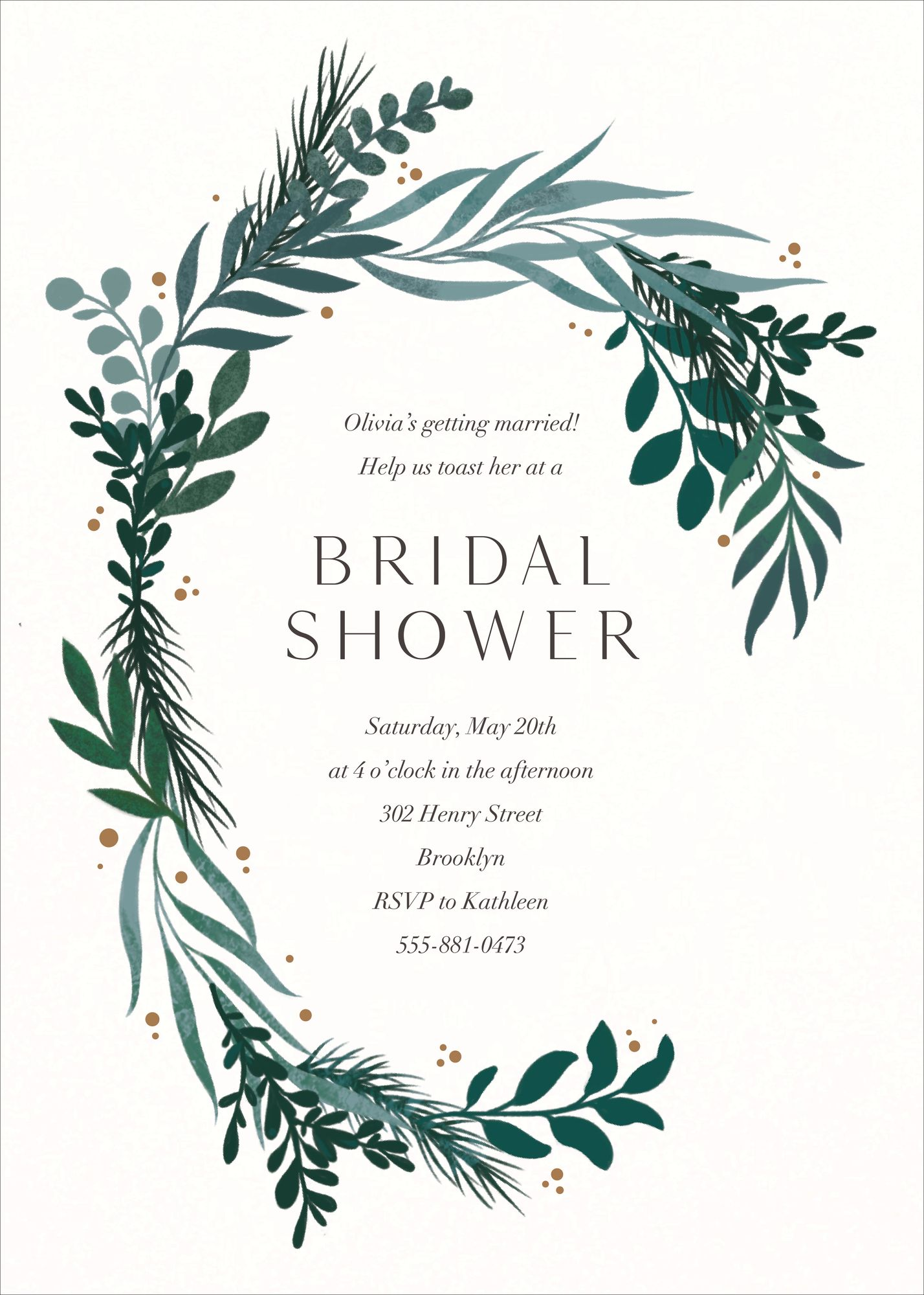 A bunch of botanical branches in glorious greens wreaths this invitation to celebrate those to-be-wed!