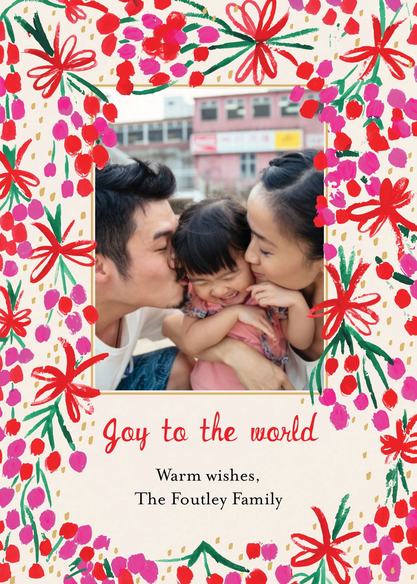 Bright red and pink blooms frame your photo with a message of joy in this design from Mr. Boddington’s Studio for Paperless Post. Printed on Mohawk ultra white, 120 lb. card stock that is soft to the touch and matches our superfine white envelopes. Paper is FSC certified and made using wind power.