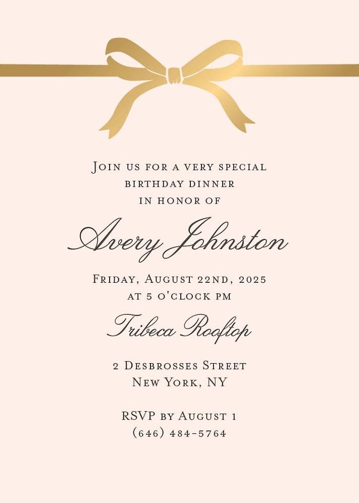 Invites guests to your special event with this custom party invitation! Design features a foil gold ribbon at the top, your details below, all against a blush background.