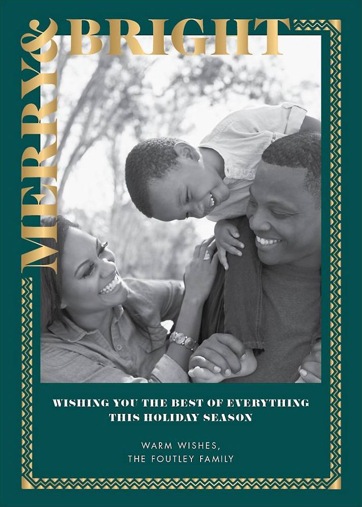 This holiday card, with a touch of gold foil, will make your photos shine as bright as your holiday spirit! Printed on Mohawk 120.0 lb Superfine Ultra White. This paper is FSC certified, with 30% post consumer recycled content, and made using wind power. Please note: Due to the matte finish of our paper, photos may print slightly darker than they appear on your screen.