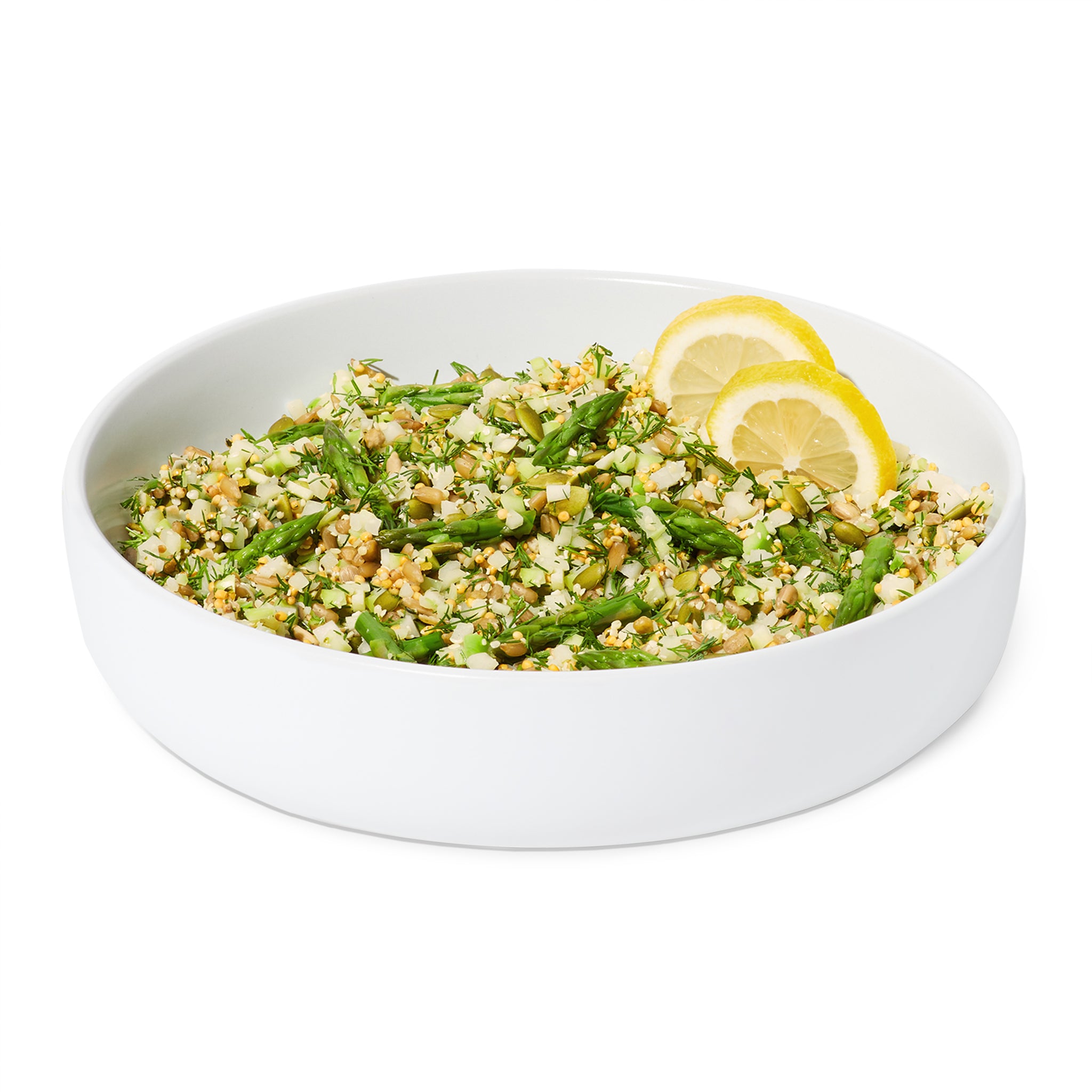 This one is light, refreshing, and crisp…and an excellent source of protein. Broccoli rice is the grain-free base for asparagus, a crunchy nut and seed blend, and bright arugula, all tossed in a lemon-dill dressing. It’s flavorful. It’s fiberful (as in, an excellent source of). And it satisfies without weighing you down.