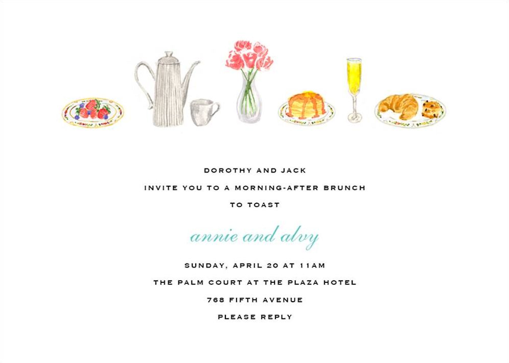 Celebrate your wedding festivities with a post wedding brunch. Gather all your loved ones to celebrate with this card featuring illustrations of brunch food. Design by Paperless Post. Printed on white smooth paper, which has a smooth finish and is soft to the touch. 130# cover weight paper with 30% post consumer recycled content.