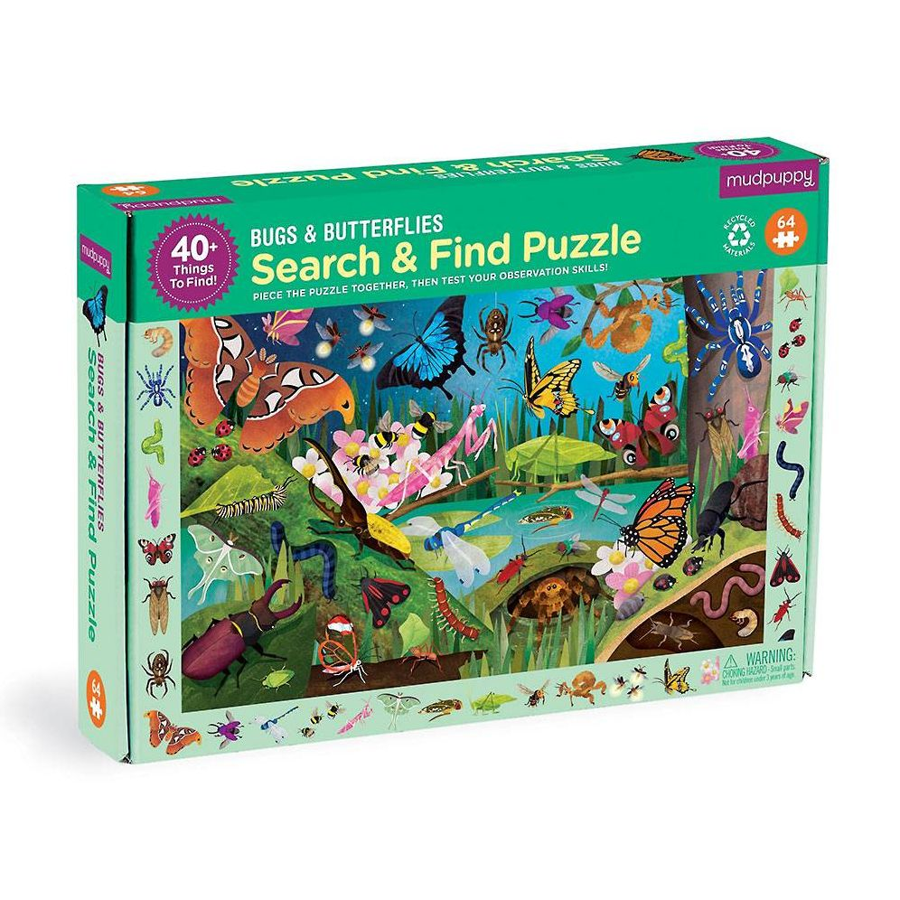 Mudpuppy’s Bugs & Butterflies Search & Find Puzzle is double the fun! First, children can piece together the 64-piece puzzle featuring a colorful assortment of insects that live in the wild, such as the Atlas Moth, Fireflies, Ladybugs and more!