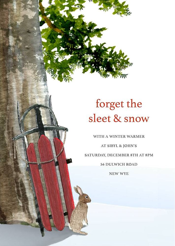 An adorable bunny gazes out over a cold winter landscape…and perhaps wishes it were at your party. From the designers at Felix Doolittle for Paperless Post. Be sure to check out photo options for the back of this card!