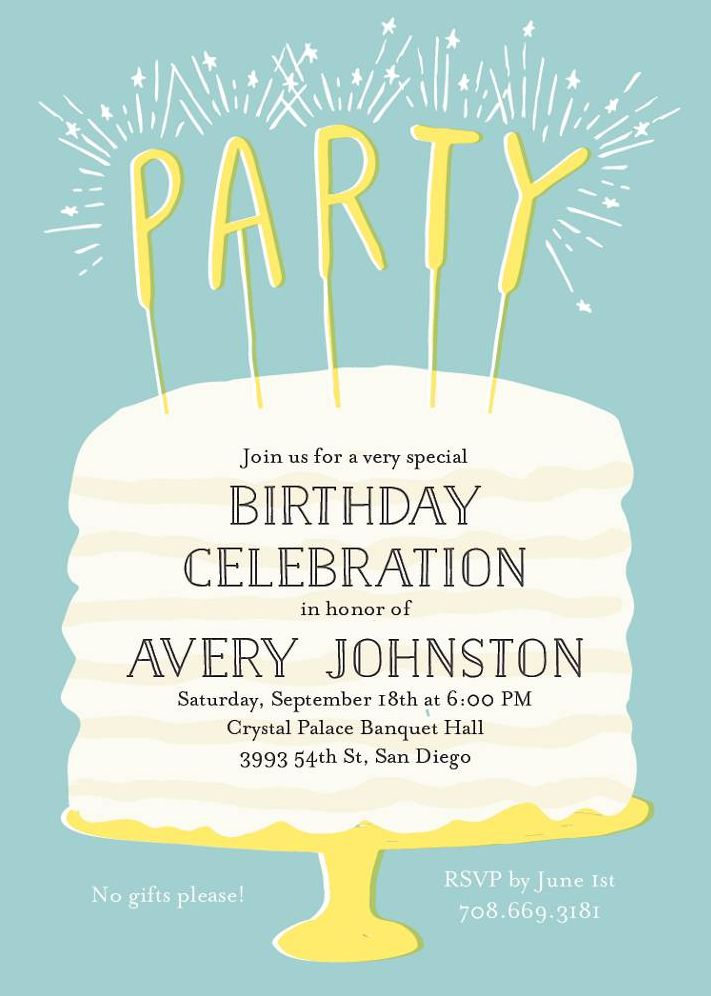 It’s not a birthday party until the cake arrives! Customize your party invitations with this fun design featuring a bright white cakes with sparklers that spell out PARTY!