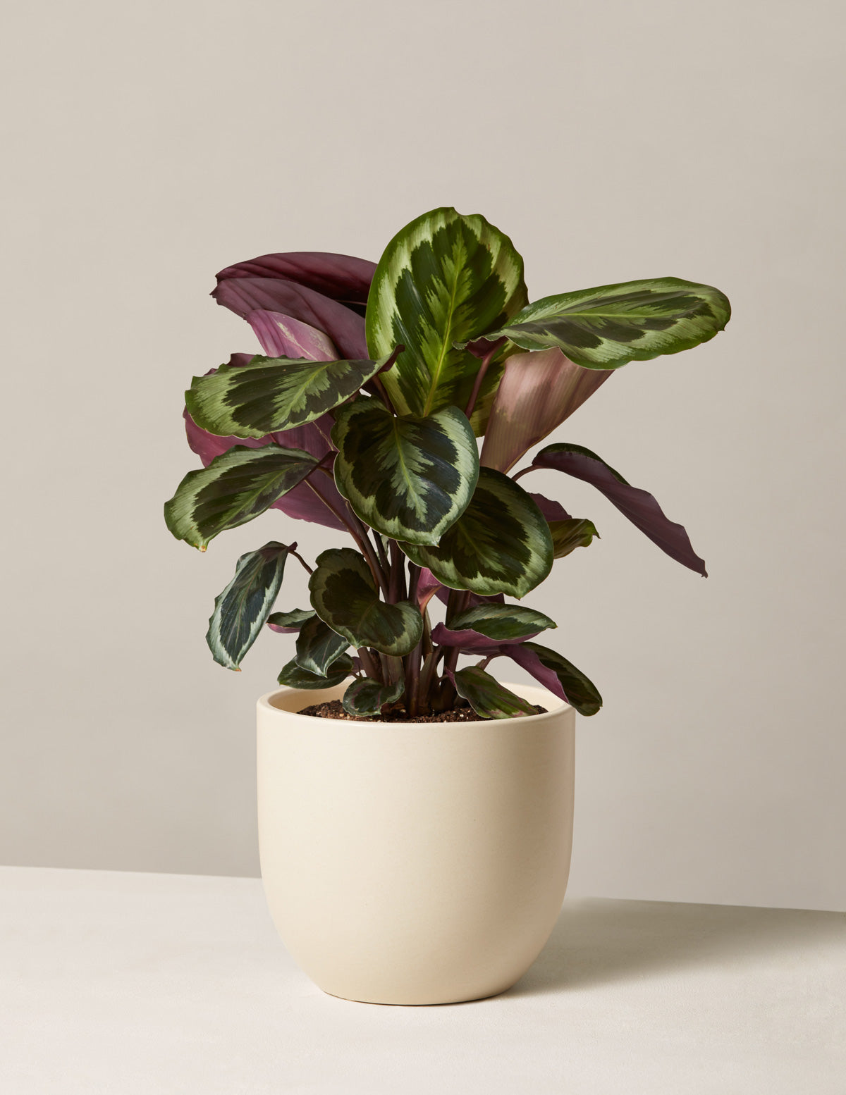 The Calathea medallion, also known as Calathea veitchiana, is a striking tropical houseplant with beautifully patterned foliage. Its leaves are oval-shaped with a rich green color and intricate, silver or cream-colored markings with purple undersides. It raises and lowers these leaves from day to night, a phenomenon called nyctinasty and the source behind its nickname prayer plant. This plant is pet-friendly!