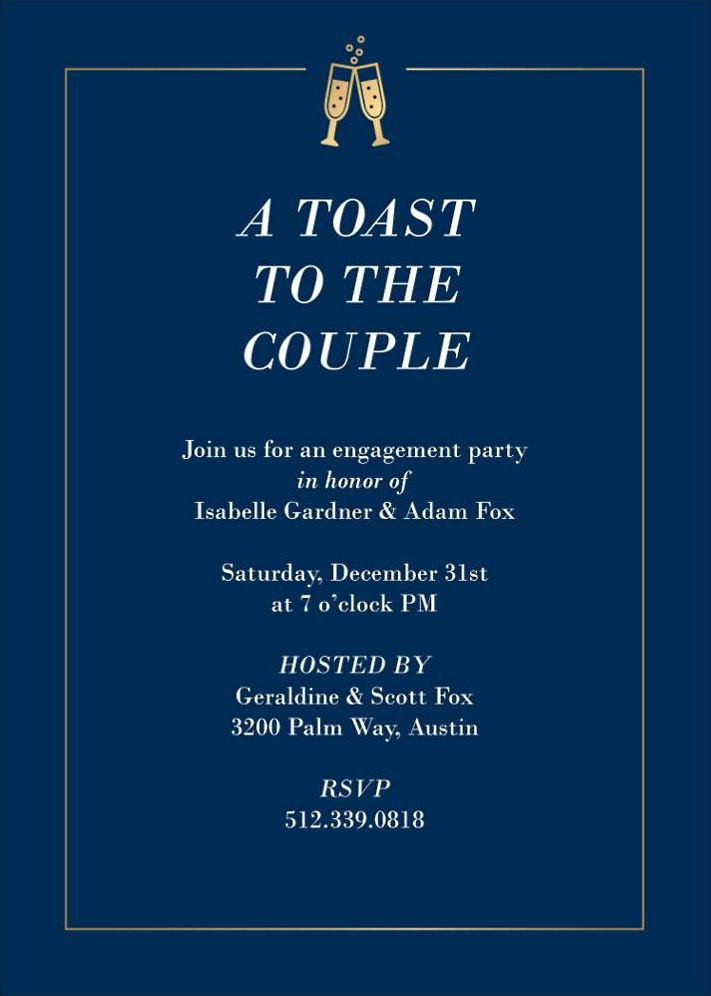 Raise a glass and toast to the happy couple with this elegant engagement party invitation! Printed on white 130 lb cover paper with a tactile vellum finish. 100% post-consumer waste, FSC certified.