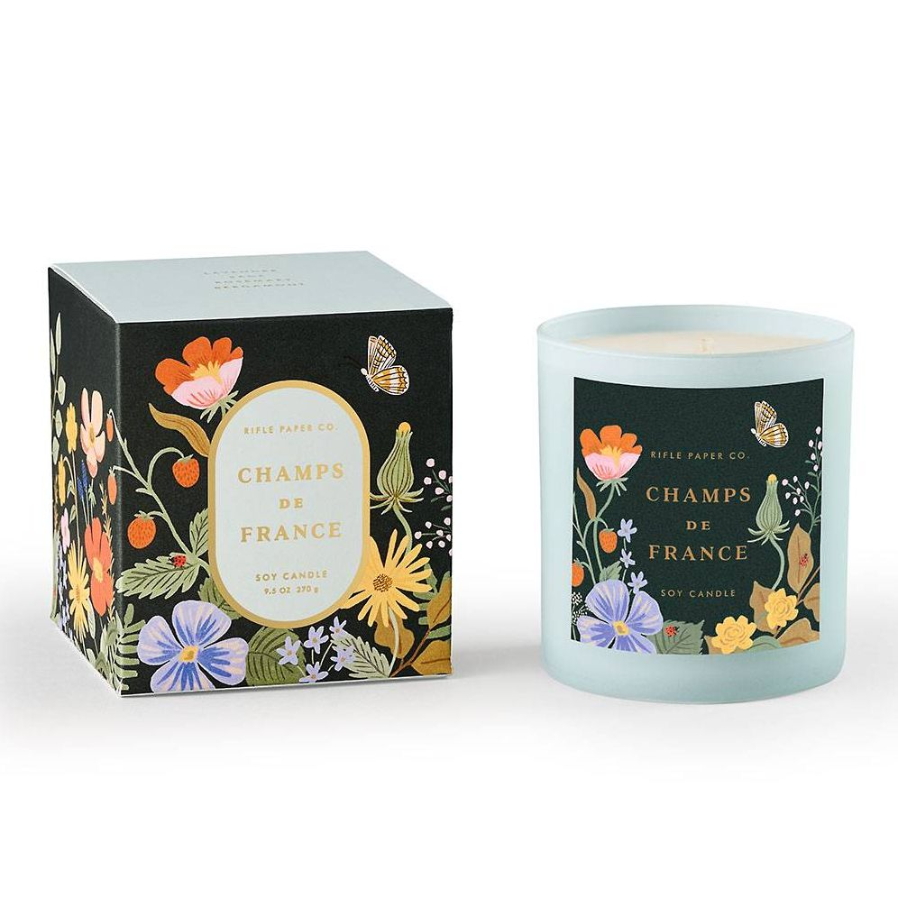 Champs de France transports you to the rolling lavender hills and herb-filled markets of the South of France for a scent that is calming, invigorating, and earthy. The 9.5oz soy wax candle comes in a painted glass vessel and is packaged in a decorative gift box with gold foil accents.