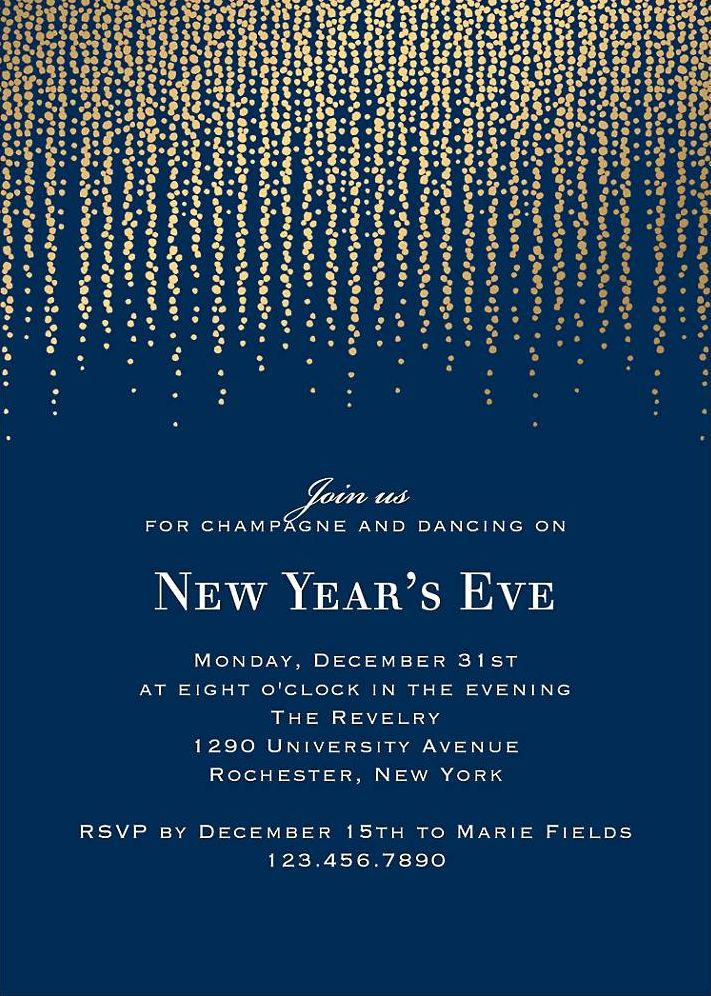 The gold foil stamped chandelier design makes for an ethereal look to these celebratory New Year’s Eve Party invitations.
