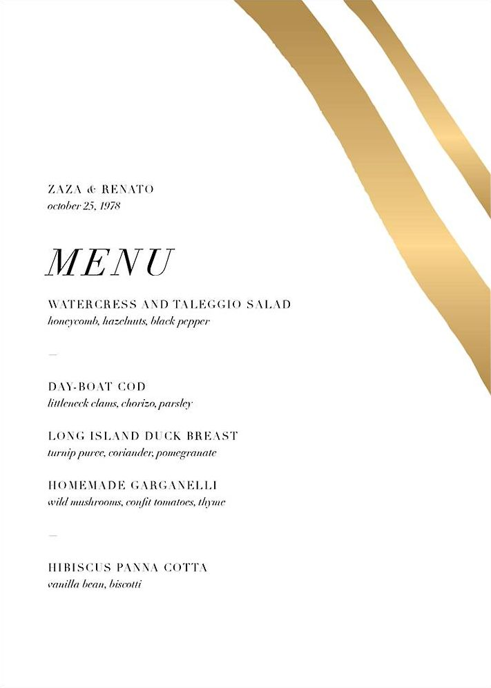 The sophisticated Cherish Foil Menu features streaks of foil in your choice of silver, gold, or rose gold, a design theme that carries over from this wedding suite’s other component pieces. Designed by Kelly Wearstler for Paperless Post. Printed on Mohawk superfine white 130 lb. card stock that is soft to the touch and matches our superfine white envelopes. Paper is FSC certified and made using wind power.