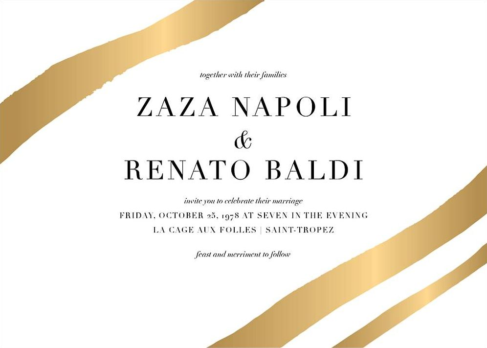 Decorative stripes in your choice of silver, gold, or rose gold foil adorn the sophisticated Cherish Foil Wedding Invitation, part of the Cherish Foil suite of wedding cards designed by Kelly Wearstler for Paperless Post. Printed on Mohawk superfine white 130 lb. card stock that is soft to the touch and matches our superfine white envelopes. Paper is FSC certified and made using wind power. Corresponding Paperless Post digital design also available.