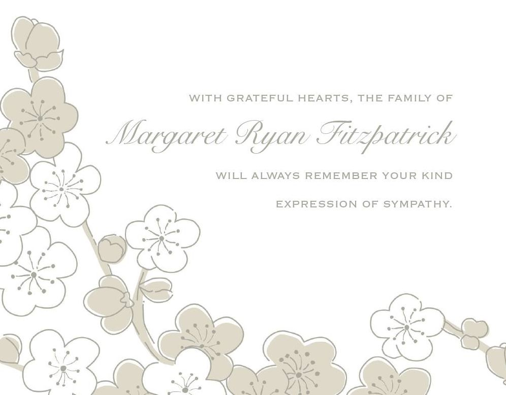 Send friends and loved ones your thanks for their support, with this beautiful Cherry Branch designed sympathy thank you note. Printed on white 130 lb cover paper with a tactile vellum finish. 100% post-consumer waste, FSC certified.