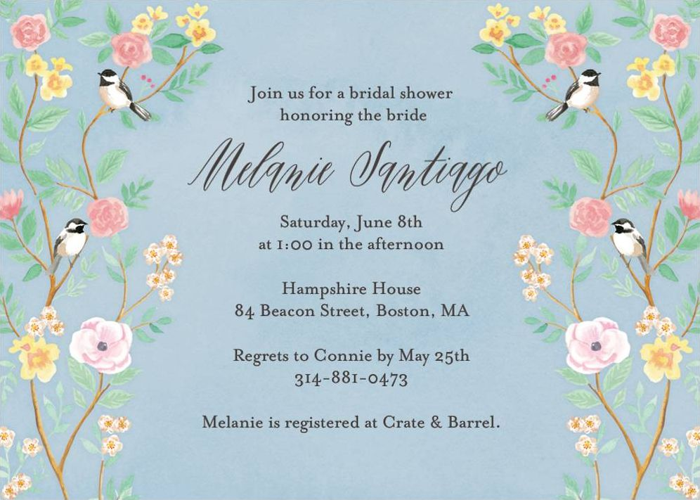 Perfect for a spring or summertime shower, this bridal shower invitation features illustrated flowers, branches and birds with the important details of the party in the center. Printed on white 130 lb cover paper with a tactile vellum finish. 100% post-consumer waste, FSC certified.