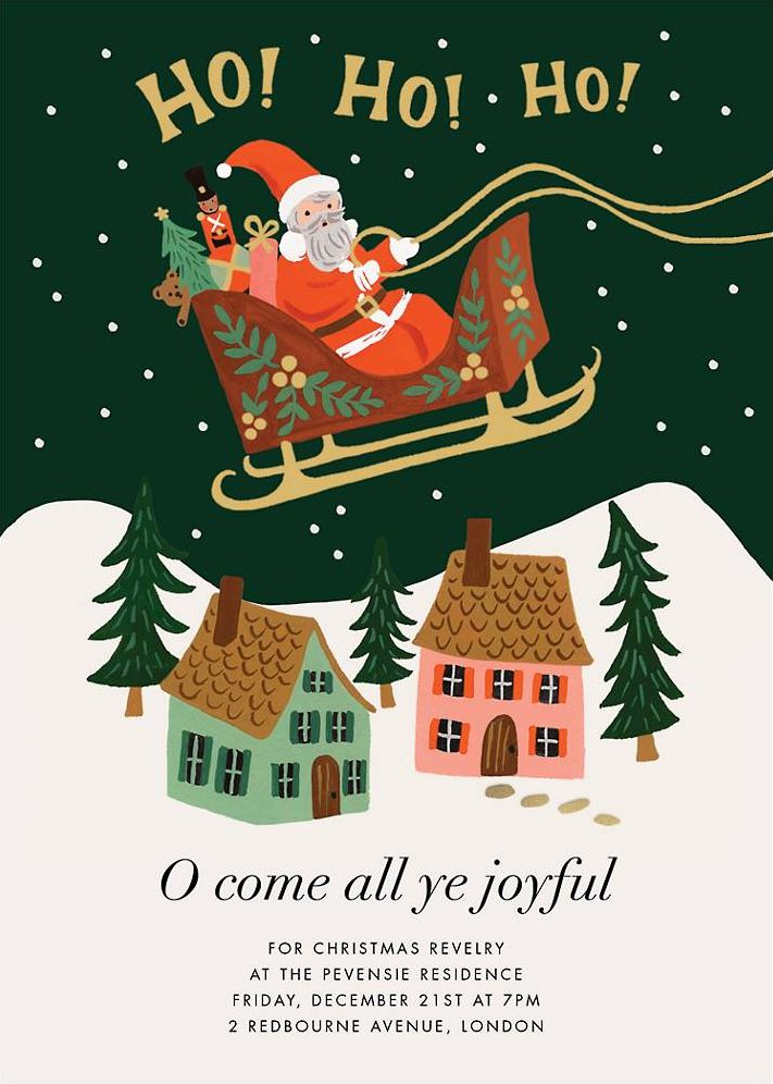 Santa and his sleigh full of gifts rides across the front of this holiday card for a dose of classic Christmas nostalgia. Designed by Rifle Paper Co. for Paperless Post.