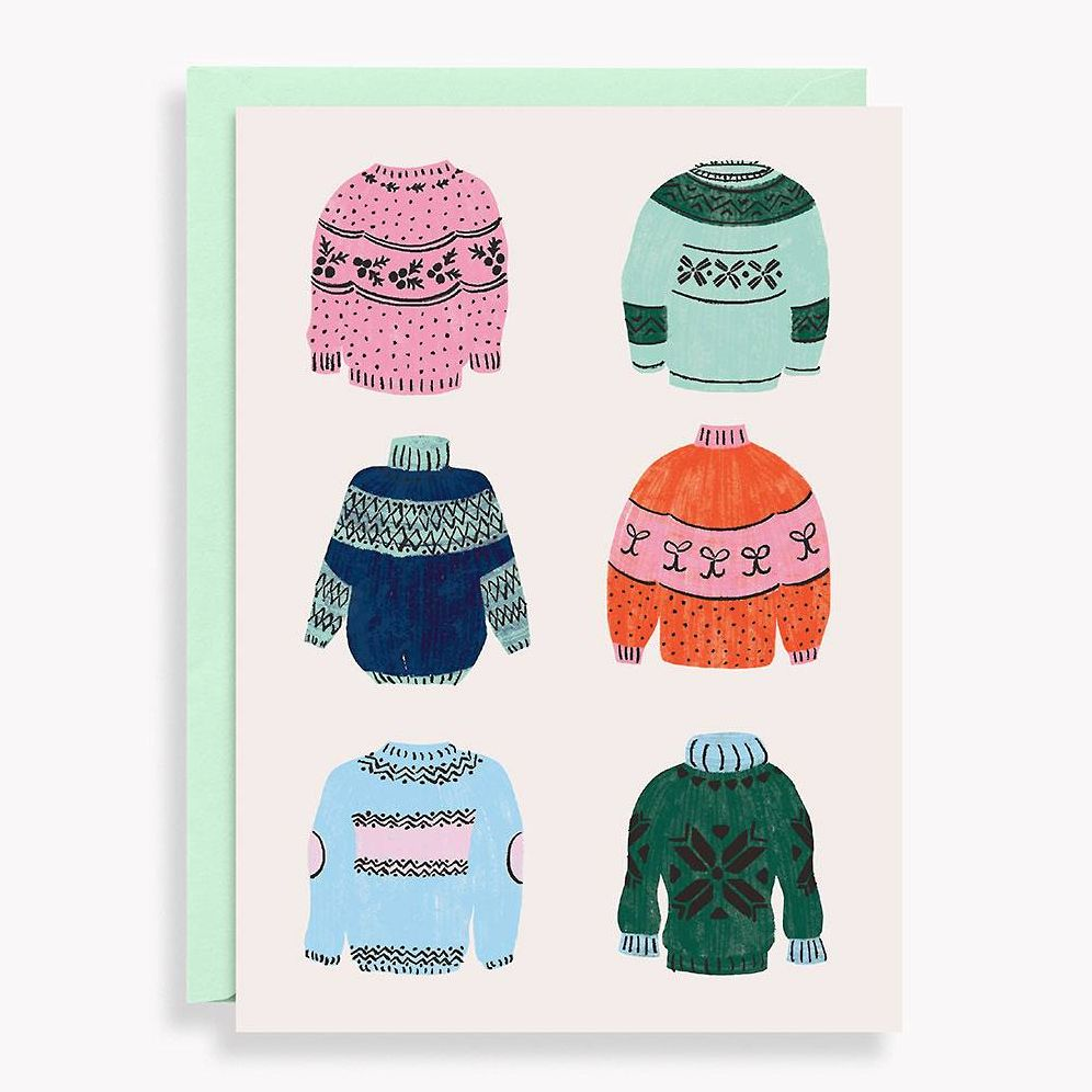What screams holiday more than Christmas Sweaters! This super fun set of 10 note cards features six colorful & cozy holiday sweaters. Foil details. A6 size for card & envelope. Comes in a clear box.