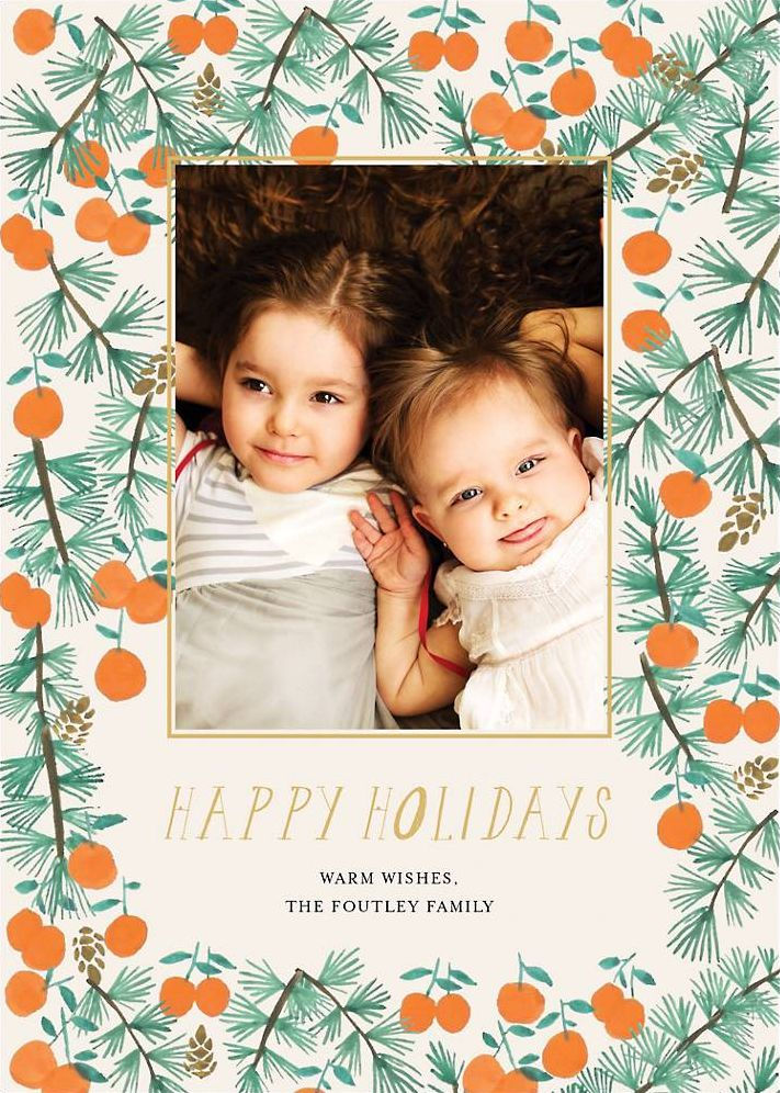 The classic scent of Christmas pine trees and oranges is brought to mind as you open this gorgeous card, designed by Mr. Boddington’s Studio for Paperless Post.