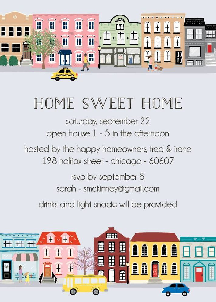 Invite friends and family to celebrate your new home with this whimsical house warming invitation. Design features a hand illustrated city scene with room for all your event details.